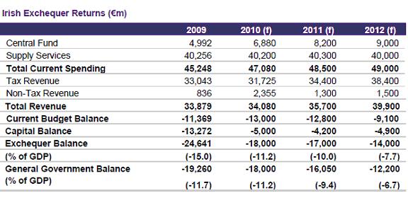 He is suggesting that the decline in GDP will be just 0.8 per cent in 2010 and of 3 per cent in GNP. He also is suggesting a much lower borrowing requirement than anyone else.