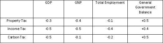 So what are the medium term effects of a menu of possible shocks? The ESRI calibrated property, income and carbon taxes to raise €1 billion in tax revenue in 2009 and the forecast effects generated for year 6 are shown below (I use year 6 here because it is the longest range forecast). If the shock occurs in 2010 then year 6 refers to 2016.