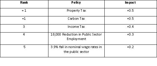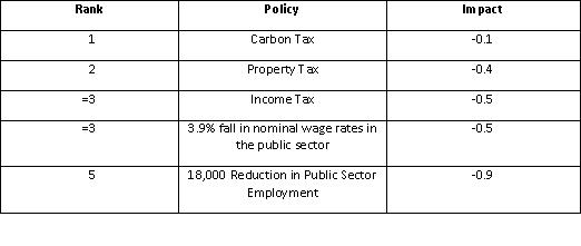 Based purely on these forecasts it would appear that both the property tax and the carbon tax on the non-tradable sector are superior alternatives to an increase in the personal tax rate. Raising income tax appears to have the most damaging impact on employment; the most damaging impact on GNP and the smallest positive effect on the general government balance. The choice between a property tax and a carbon tax is less clear cut; however what is clear is that either option will negatively impact both growth and employment. The carbon tax will be more successful in minimising the damage to economic growth (an impact of -0.1 on GNP compared to an impact of -0.4 from the introduction of a property tax). Thus if output is the policy goal then a carbon tax seems preferable. However, pursuing a carbon tax in lieu of a property tax will come at the cost of extra jobs lost. The latest Quarterly National Household Survey estimates that there are currently 1,887,400 people in employment. Thus a decline of just 0.1% in employment is equivalent to a decline of almost 1,900 jobs.