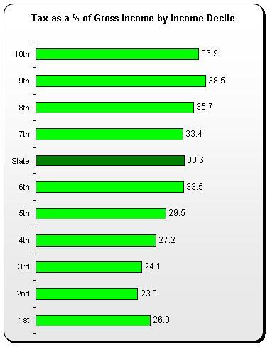 As can be seen from the chart, when indirect taxation is included, the tax liability of the highest income group – 37 percent – is not much more than the national average – 34 percent. Given that the lowest income decile pay 26 percent, the level of progressivity is highly limited.