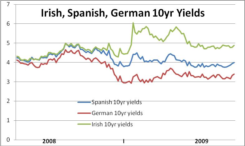 Irish 10yr yields were the highest in the EU for most of 2009, as austerity was being implemented, in contrast to the rest of the Euro Area, where various types of stimulus measures were attempted. The reassurance that bond investors need is that you can meet interest payments and repay debt as it falls due. For governments that can only come from tax revenues.