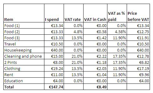 But let’s just stick with the €147.06 total for the moment. I got more details on Ireland’s VAT from an EU publication. This gives the following information about VAT, based on the above spending: