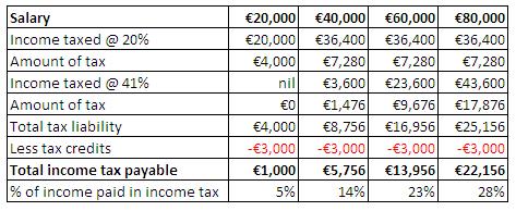 For reference, the current rates are 20 per cent on all income up to €36,400, and 41 per cent as the marginal rate. A single person gets €1,830 in personal tax credits. PAYE workers get an additional €1,830 (Citizens Information). For example, single PAYE workers on €20,000, €40,000, €60,000 and €80,000 would pay income tax as follows: