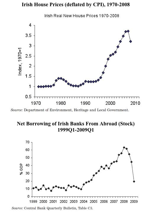 Tom McDonnell: One of the images below is from Patrick Honohan's paper in the Economic and Social Review June 2009. If you combine the two you can see how the foreign banks (as they were the main holders of the Irish banks' bonds) were what funded the last 1/3 of the Irish bubble, i.e. its wildest phase.[click to enlarge images]