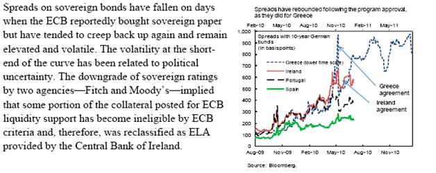 • According to IMF, Irish yields have only been falling because the ECB have been buying bonds- other market participants don’t want to touch them (as of yesterday 10yr yields are back over 9% and closing in on the previous high). This deal is making any future market access less, not more likely