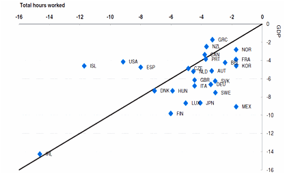 Figure 2: Percentage decline in GDP and total hours worked from peak to trough