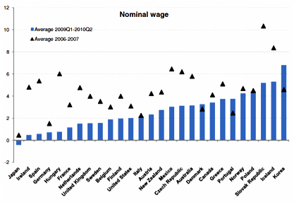 The OECD also examine nominal wage and labour costs. In most countries, wages decelerated sharply with labour costs also largely decelerating. The data presented in Figure 5 in the OECD report (reproduced below) shows changes to wages and labour costs before and after the crisis. What we find is that increases in nominal wages and unit labour costs just before the crisis hit were broadly in line with increases in the OECD. See here for a further discussion on unit labour costs. The OECD data shows that Ireland had the second lowest growth in nominal wages in the OECD between 2009Q1-2010Q2, and the largest fall in labour costs in the OECD during the same period.