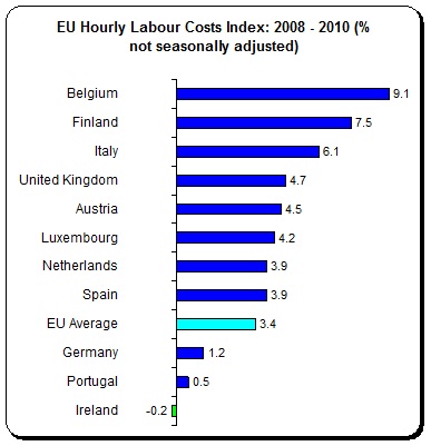 Ireland is in the bottom half of the EU-15 league table – 6 percent below the average of the other countries. This was in 2008 – the last year of rising personal income. In 2009 and 2010, Irish labour costs in this sector have fallen further behind the EU-15 average.