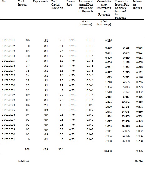 Renegotiating the promissory notes is of huge consequence to Ireland’s future prosperity. Michael Noonan hints here that he has begun the process of renegotiation. We can extrapolate from these new figures that the total cost between 2011 and 2031 will be in the region of €85 billion (assumes a 4.7% interest rate from 2013 onwards). That is €4 billion a year. The infinite spiral of cumulative interest costs is the reason why the figure is larger than the commonly cited €47 billion i.e., we have to pay interest on the €47 billion in borrowings and then pay the interest on the borrowings required for those interest payments and so on and so forth (click on table to enlarge).