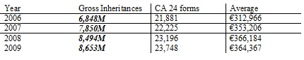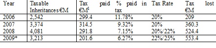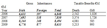 There are huge discrepancies between gross inheritances and taxable benefits taken at death with just 37.1% of the gross being taxable in 2006 & 2009 with higher figures in the intervening years. No reasons were given for the size of the difference.