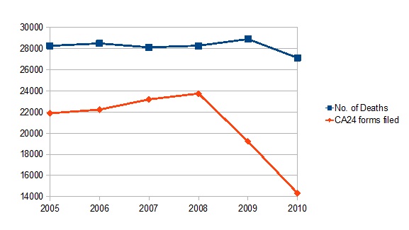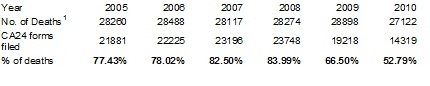 1. No of deaths for 2005 to 2008 are actual deaths in the year, for 2009 & 2010 it is the number of deaths registered.