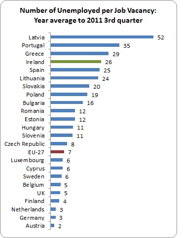 No matter what is done using supply-side policies –through training, up-skilling or negative incentives – you cannot squeeze 310,000 unemployed into the approximately 13,000 total jobs that are available (calculated from the most recent Eurostat data, 3rd quarter 2011). Even if all the vacancies are filled instantly, approximately 300,000 will remain unemployed. Essentially, what training does in terms of unemployment in this situation is to change the names of the lucky ones to get jobs.