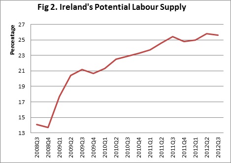 Labour market participation is down as people are staying at home or in education. A key indicator of unemployment is those who would like to work but who stay in education or at home because they are discouraged workers. The total of those who would like to work was up to 25.6% at end September 2012 as Figure 2 shows.