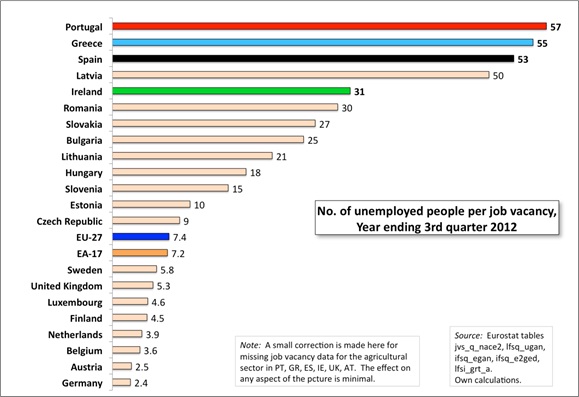 An important indicator is the job vacancy rate. The chart below (Figure 6) show that there are 7.4 unemployed per job vacancy in the EU27, but in Ireland, there are 31 unemployed. It is not as bad as Portugal, Greece, Spain and Latvia, but this scale of unemployment is at a dangerous level.