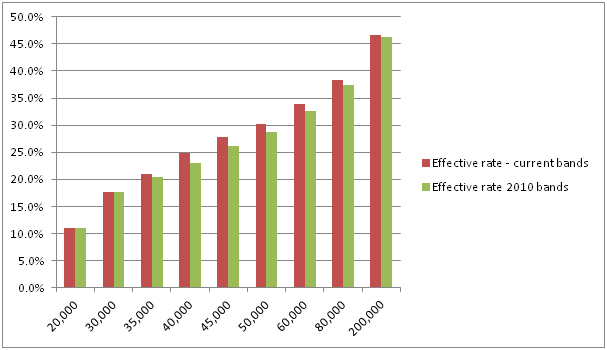 We can show effective rates (including USC and PRSI) using tools such as the Deloitte Tax Calculator. We can then compare two different scenarios (for a single person); the current system and a hypothetical system where the tax band has been widened. As an example, we can show what would happen if threshold was raised from €32,800, to €36,400 (which is where the cut off was in 2010) to see who benefits from a widening of the bands.
