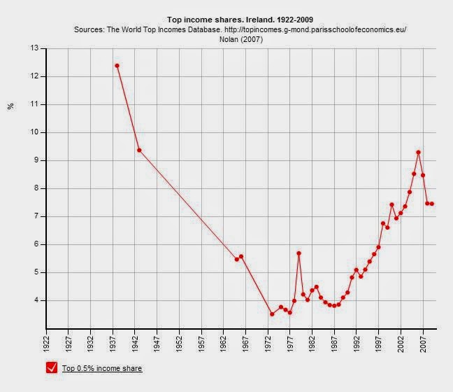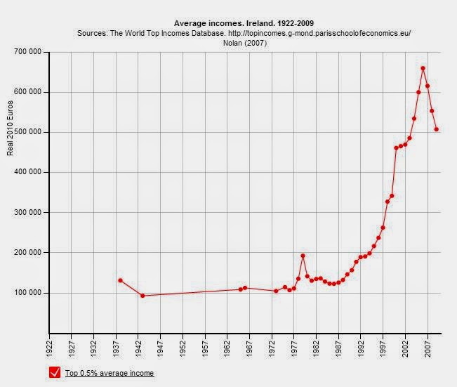 But we do know about the rise in incomes of the top 0.5 per cent of tax units (individuals or households). Using the World Top Incomes Database, which is based on tax data, we know that the top 1 in 200 taxpayers in Ireland have incomes that average €500,000 - five times more than their average income of €100,000 (in today's money) in 1977.