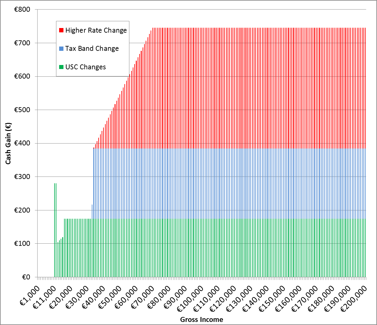 After €32,800 people are hit with a triple benefit. They have a lower rate of marginal tax (40%), a later entry point to the higher rate (by €1000), and they benefit from the changes made to USC on the earlier parts of their income.