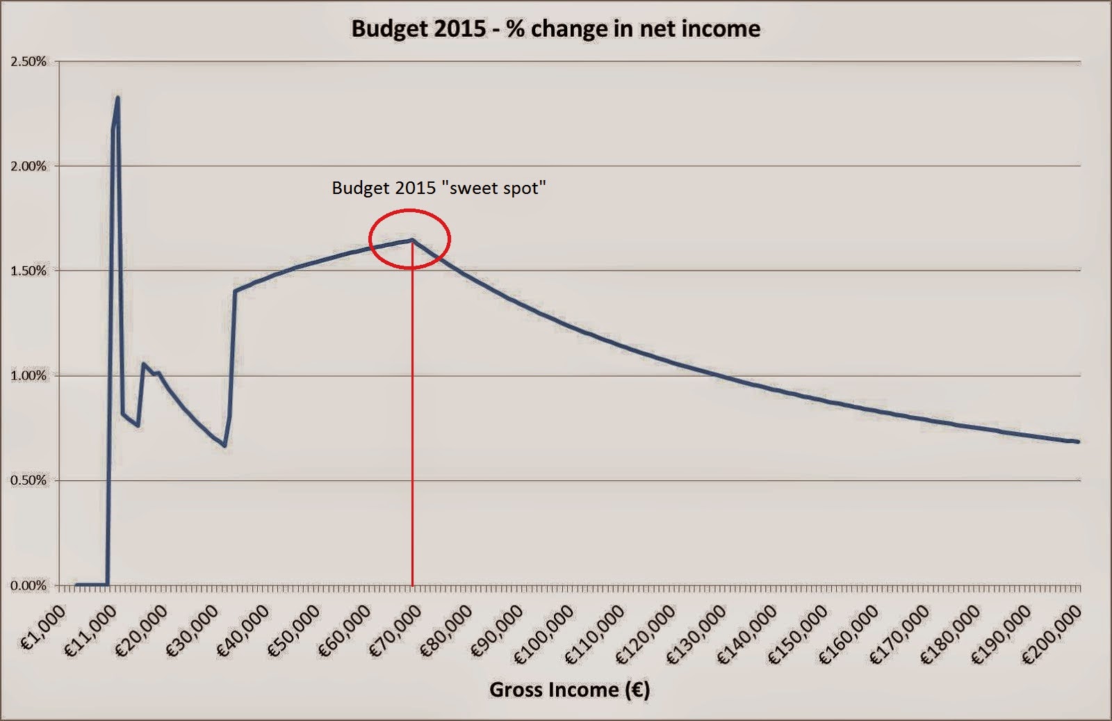 But the focus seems to be squarely on reducing the marginal rate on the group between €33,800 and €70,000. What we have seen from Budget 2015 is that cutting marginal rates for this group give the greatest benefit for those on the highest incomes (€70,000 and above), not those near the middle.