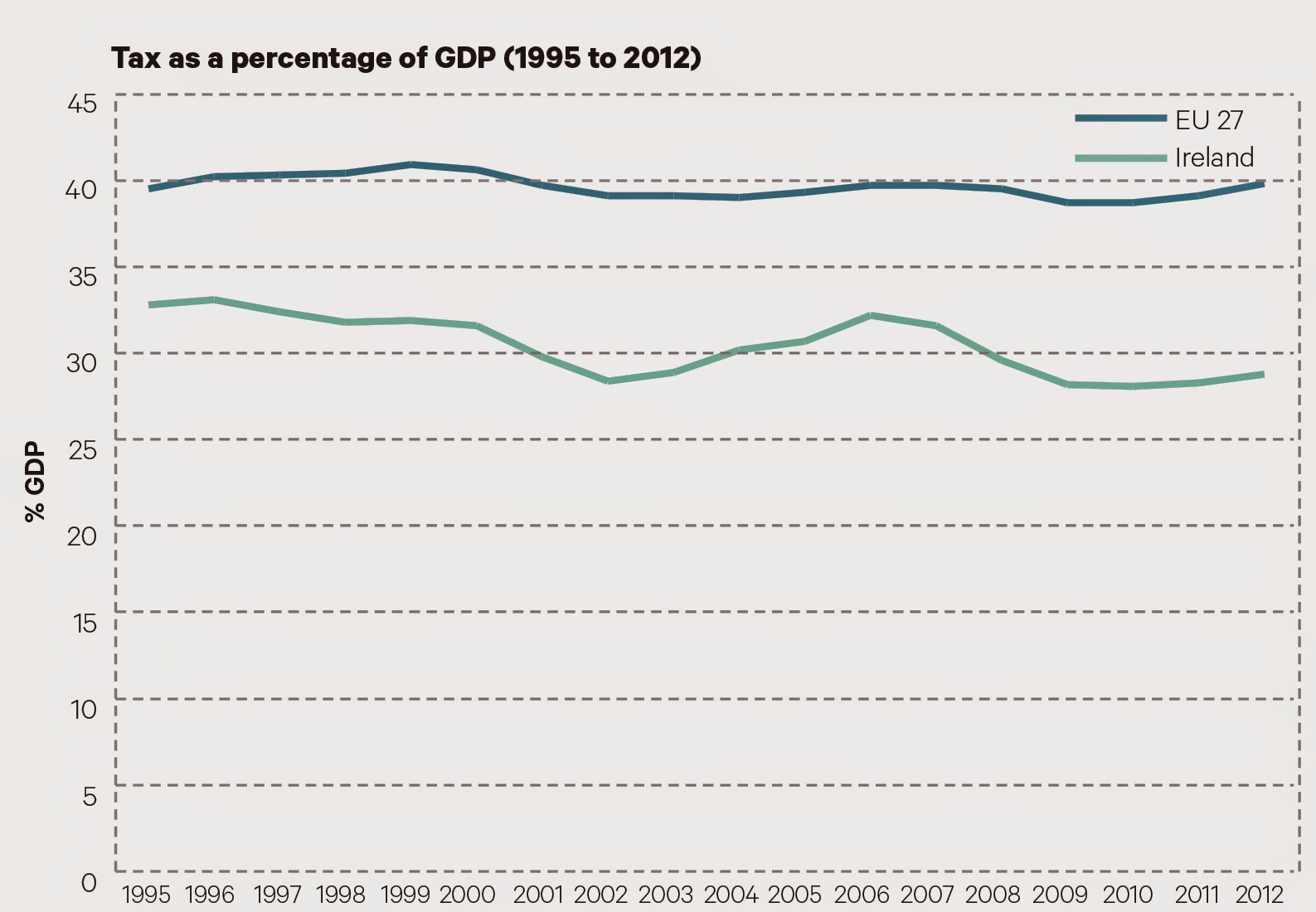 Taxes on consumption, which are the same for everyone regardless of their income, make up more than a third of all tax revenue in Ireland, making the system more unequal. Taken as a whole, Ireland has far lower taxes and social insurance as a percentage of GDP than the EU average.