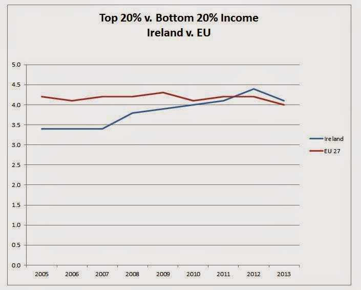 And, using another common measurement, the top 20% has 4.1 times the income of the bottom 20%. That's up from 3.4 times in the period 2004-2006, which is a large increase (Eurostat). But O'Brien doesn't name the statistics or sources he is relying on when he claims "available data" shows no rise in inequality.