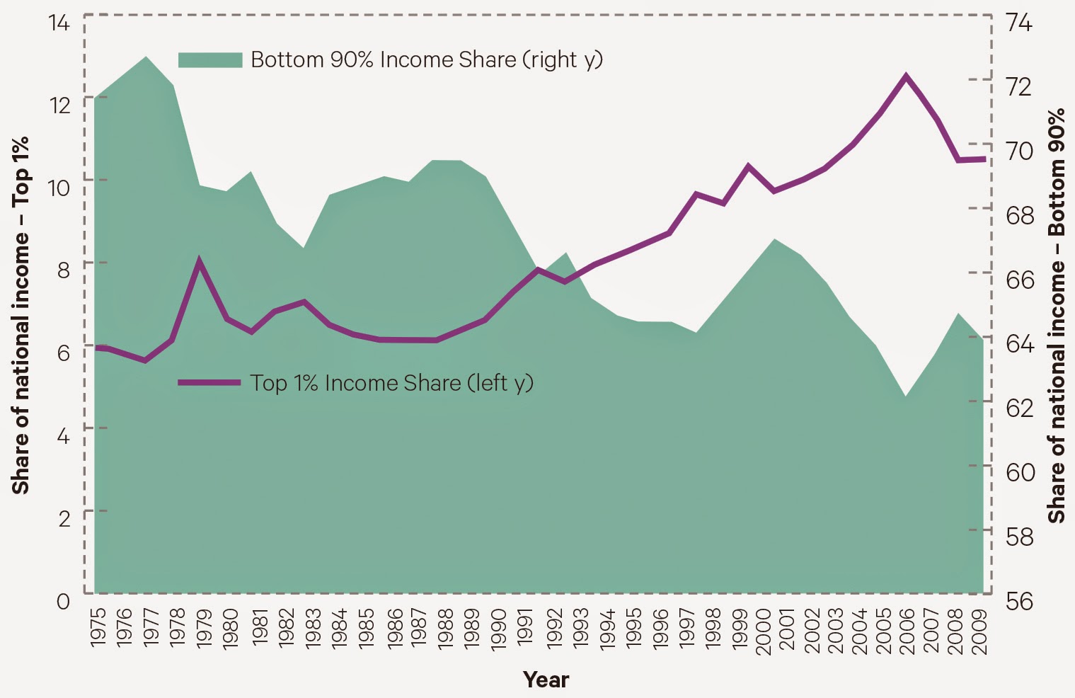 During the period of economic growth from the early 1990s, the share of income earned by the Top 10% in Ireland rose, meaning that the vast majority of people, the ‘Bottom 90%’ of the population, lost a proportional share of the national income. The Bottom 90% share of national income fell from 71.4% in 1975 to 63.9% in 2009.