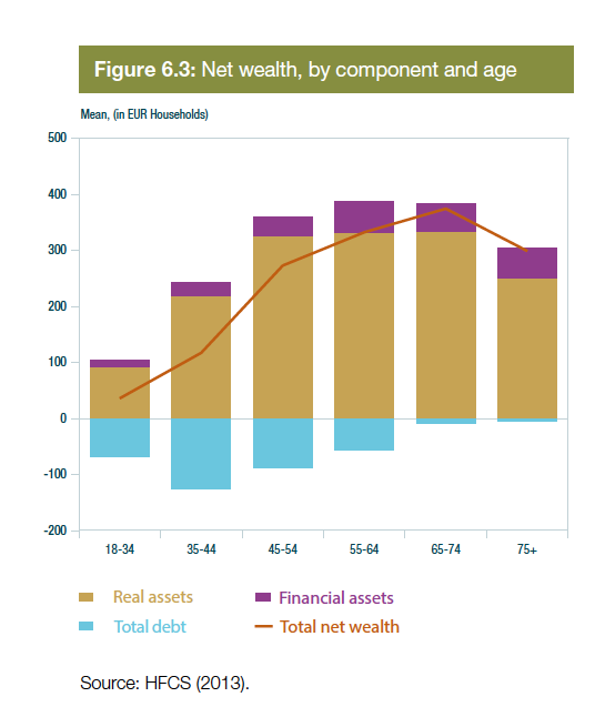 The study shows three very interesting points. First it shows how important property is as the major form of wealth in Ireland. Secondly the study shows how important debt is too, for it is at extraordinarily high levels today. The net position of the 35-44 years olds is greatly reduced by high debt. The third factor is the uneven distribution of wealth between social classes (not shown) and also between age cohorts. Older people have had more time to build up wealth and those with higher incomes can accumulate wealth and pay down debt faster than those with low incomes.