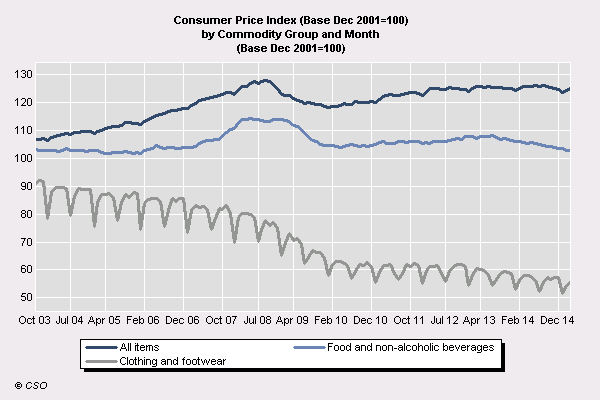 You can see a shocking rise in the cost of Irish education while food and clothing have fallen. While overall prices have been stable in the past 7 years, education rose substantially.
