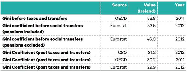 We see that social protection payments bring Ireland from being the most unequal country in the OECD (before taxes and transfers) to around the average when taxes and transfers are included (see Table 1). Note it is the impact of social welfare, rather than taxes, which does most to reduce inequality.