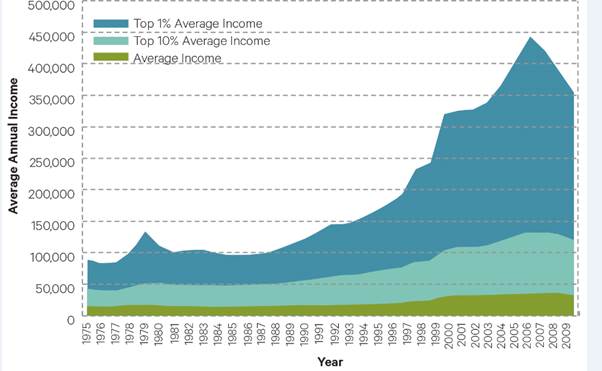 At the same time, the top 1% doubled their share from 6% in 1975 to 12% by 2006 (Chart 2, Purple line).