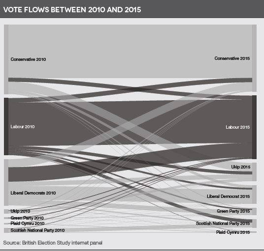 The data on voter flows from one party to another show clearly that only a small proportion of the increase in support for UKIP in 2015 came from Labour voters. (See below.)