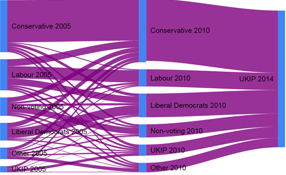 A much larger proportion of UKIP support in 2015 came from former Tories and from former LibDem voters. This is not a 2015 specific finding. Prior to the election Geoff Evans and Jon Mellon of the University of Oxford reported similar finding for the period leading up to 2014. The below diagram shows voter flows between parties from 2015-2010 and voter flows to UKIP for the 2014 local and European elections.
