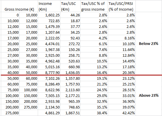 Firstly in terms of what people pay in tax, Table 1 shows that those above €50,000 pay on average more than 23% total income tax/USC/PRSI (and would get a tax cut). Those below €50,000 currently pay less than 23% and so would experience a tax increase. (NB these are tax units, not individuals. Some will be married couples. Also Revenue give a figure for tax and USC paid. I have added 4% for those above €17,000 to account for PRSI).