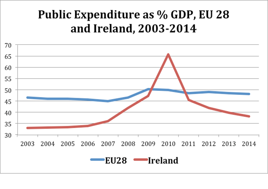 The level of public expenditure in Europe (28 states) was 48.2 percent in 2014, compared to Ireland’s 38.2. Even adjusting Ireland upward by using GNP, we would still be below the average for the EU.