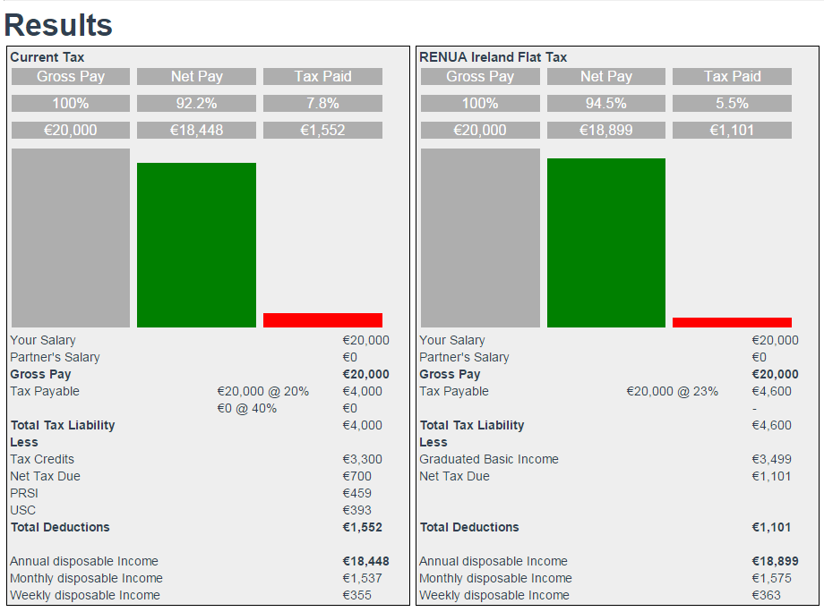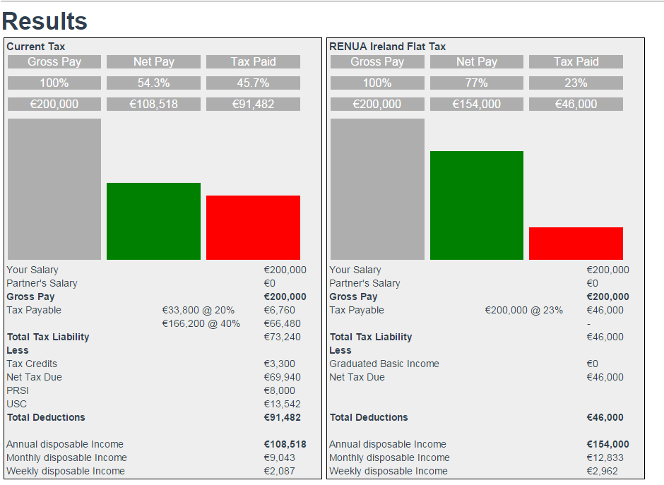 The results from Renua’s tax calculator (at http://www.renuaireland.com/tax-calculator/) shown in the graphs below highlight that if their flat tax (plus graduated income benefit) was introduced: