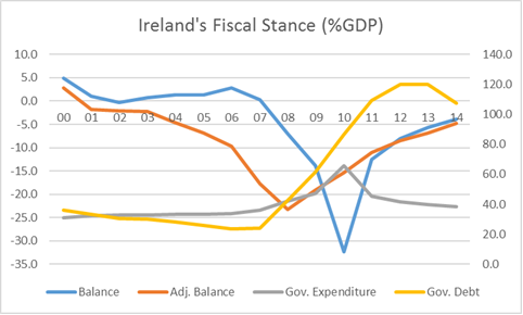 Notes on graph: The Fiscal Balance and Adjusted Balance are shown on the left-hand side, Expenditure and Debt are shown on the right-hand side. Adjusted Balance taken from IMF’s World Economic Outlook. All others are taken from Eurostat.