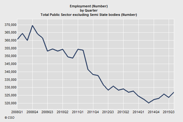 The impact of the moratorium can be seen in the dramatic fall in numbers employed in the public sector from 369,000 in 2008 to 327,100 in 2015 (see Chart 4 below). The result is that generation Y has effectively been shut out of the public sector. We now have the situation where the average age of staff in the Civil Service is close to 50 and just 4 per cent are under 30.