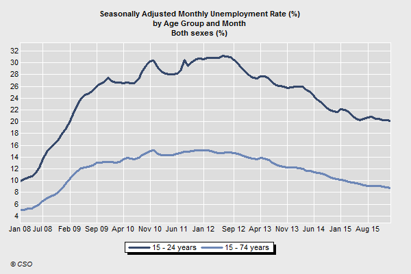 Meanwhile Chart 1 shows that the youth unemployment rate (for those aged 15-24) hit its highest point in the recent recession of 30% in 2012. This was double the highest rate hit by the general unemployment rate (for those aged 15-74). And while the general unemployment rate has fallen to 8.8% youth unemployment is still an extremely high 20.1%. This is significant when the social welfare reduction for those under 26 still remains in place (with those under 25 on €100 versus €144 for 25 year olds and €188 for those over 25).