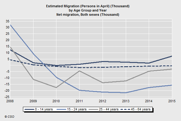Chart 3 Net Migration from Ireland for various age groups 2008-2015
