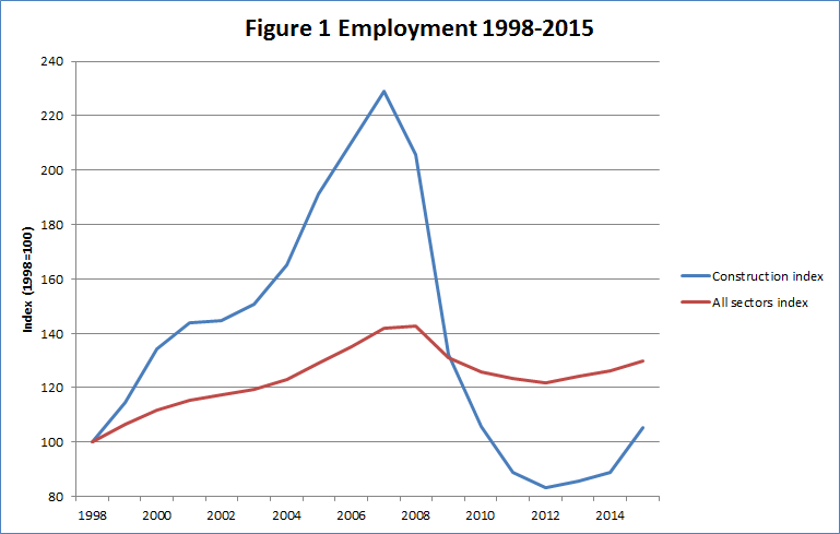 The last fifteen or so years in Ireland have been a dramatic example of how boom and bust in construction employment magnifies changes in the rest of the economy. Using index figures (1998=100) Figure 1 shows how between 1998 and 2007 employment in construction more than doubled, whereas in the economy as a whole in the same period employment rose by only about 50%. In the next four years employment as a whole fell, but employment in construction more than halved.