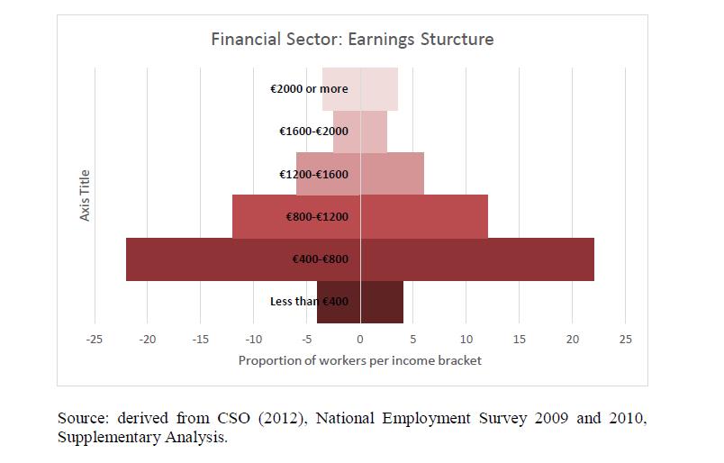 Relocating financial service activities from London to Dublin would mean relocating jobs – many of them for high earners from outside Ireland. Already financial services is one of the employment sectors most concentrated in Dublin. Most jobs in financial services are well paid. However, earnings within the sector are also more unequal than in other sectors. While the largest group of employees earn between €400 and €800 a week, a significant number earn over €2,000 per week (Chart 1).
