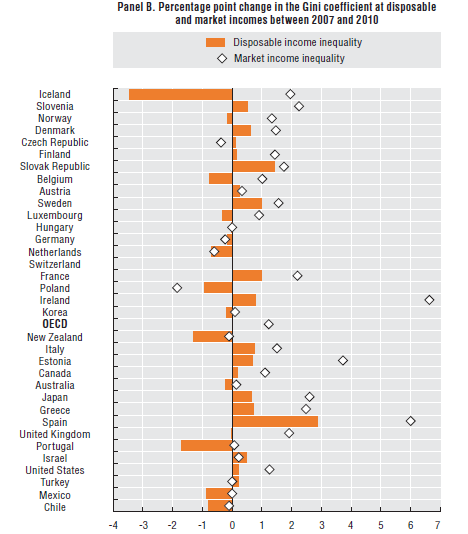 Figure 2 Change in Gini for disposable and market incomes 2007-2010 Source: OECD (2014: 111) |