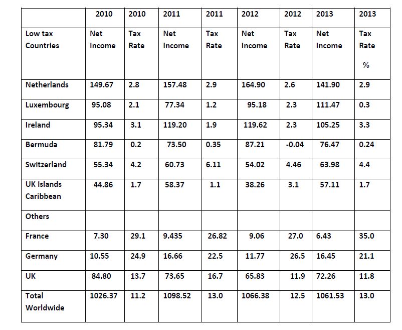 Finally the table shows that France (35%) and Germany (21.1%) followed by the UK (11.8%) have much higher effective tax rates. Even though effective tax rates are higher in France, because far greater income is declared in Ireland, tax payments in Ireland ($3.58 billion) for 2013, are higher than In France ($3.45 billion).