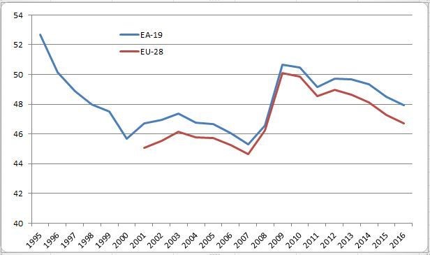 So what do the facts say? The AMECO database has a consistent and comparable series for government spending going back to 1995*. Expressed as a share of GDP, they give us a snapshot at almost a quarter century of spending trends under the regressive influence of monetary union, stability pact and the “voiding” of national parliamentary democracy in Europe.
