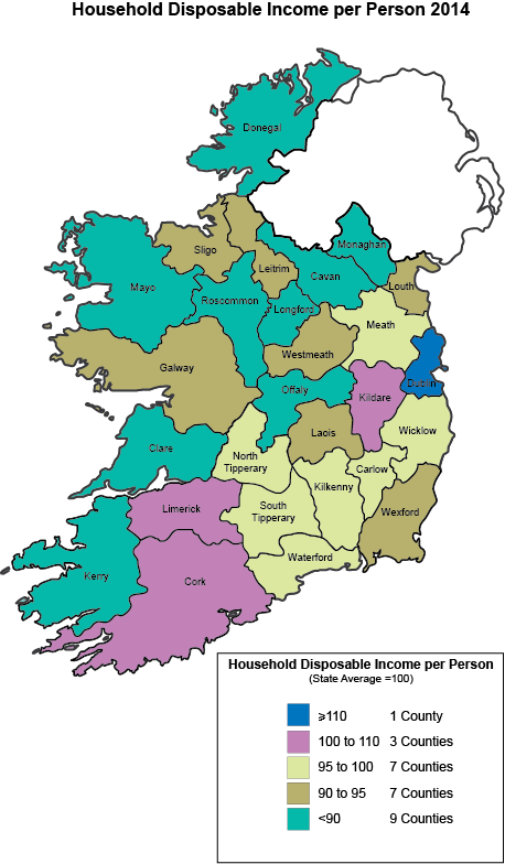 Dublin continues to remain the only region with higher per capita disposable income than the State average during the entire 2006-2014 period while the Midland, Border and West regions continue to earn less than the State average.