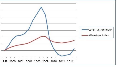Nearly everywhere, the construction industry is pro-cyclical. When the economy is growing, employment in construction grows faster, and when the economy slumps, employment in construction crashes. The Irish experience in the last boom and bust was however an extreme case. Notoriously the final stages of the boom were driven by housing construction. In 2007 there were 89,000 housing units completed, in 2013 just 8,300 (Forfas 2013). Figure 1 shows employment in construction as compared to total employment in Ireland between 1998 and 2015: